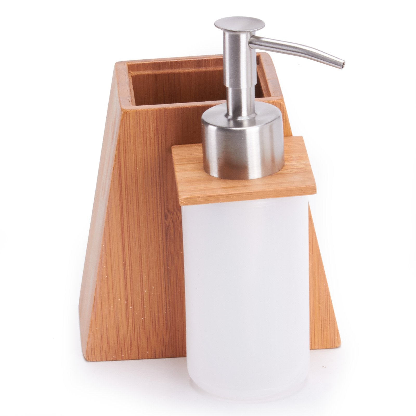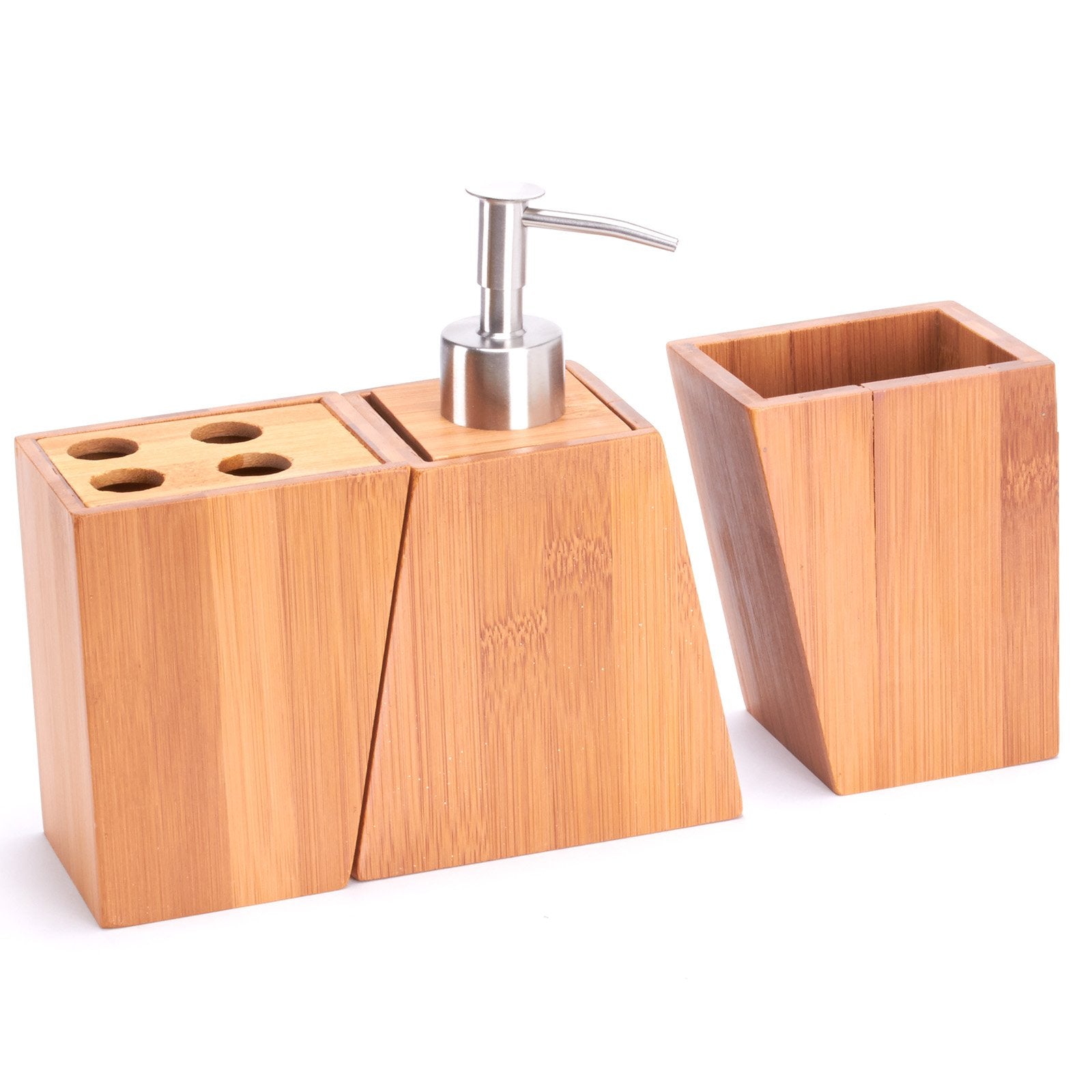 - Fabricados en madera de bambú, se compone de un dispensador de jabón líquido, con dispensador en acero inoxidable, un vaso, y un portacepillos