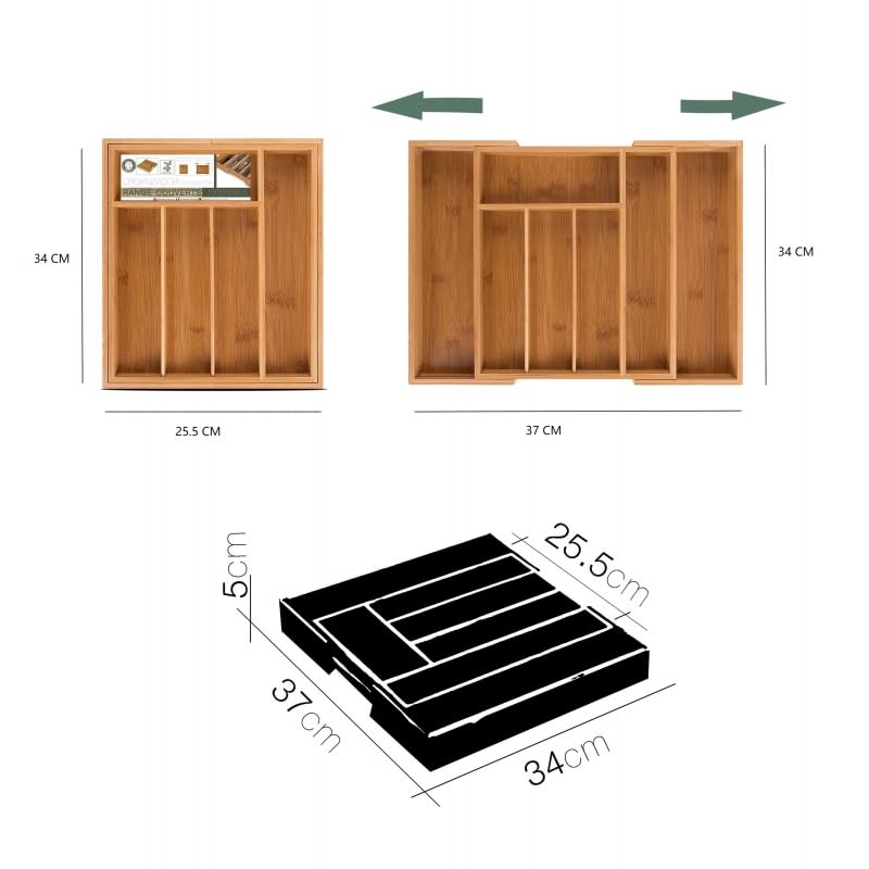 Gracias a su diseño extensible, este cubertero se adapta fácilmente a cajones de cocina con un ancho de 25,5 a 37 cm, evitando errores de medida y aprovechando mejor el espacio disponible.