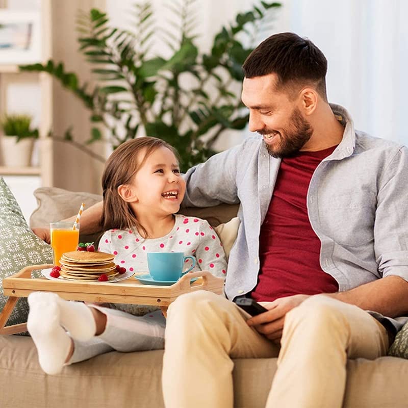 Bandeja para Cama de bambú Para que su taza y todas las golosinas tengan una base firme en el desayuno en la cama, esta bandeja de cama es indispensable. Con sus patas retráctiles, se convirtió rápidamente en una bandeja de servir. El borde exterior elevado garantiza que nada se deslice hacia abajo al pasar de la cocina al dormitorio. Con la bandeja de cama de bambú, puede sorprender a su amante o su ser querido o simplemente disfrutar de un poco de relajación en la cama. Incluso para un acogedor después del trabajo en el sofá con vino y un libro, la bandeja de la cama es un accesorio práctico que no debe faltar en ningún hogar. Entonces, no solo se reaviva el amor, sino también un asunto caliente con la bandeja del desayuno.