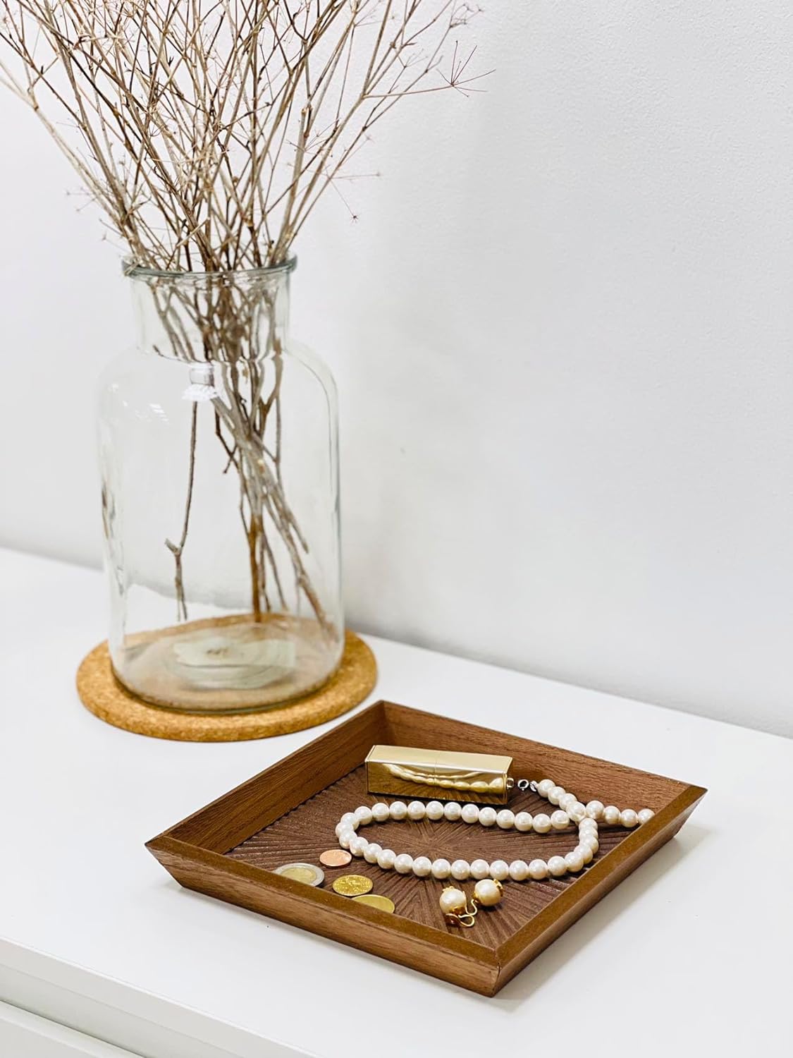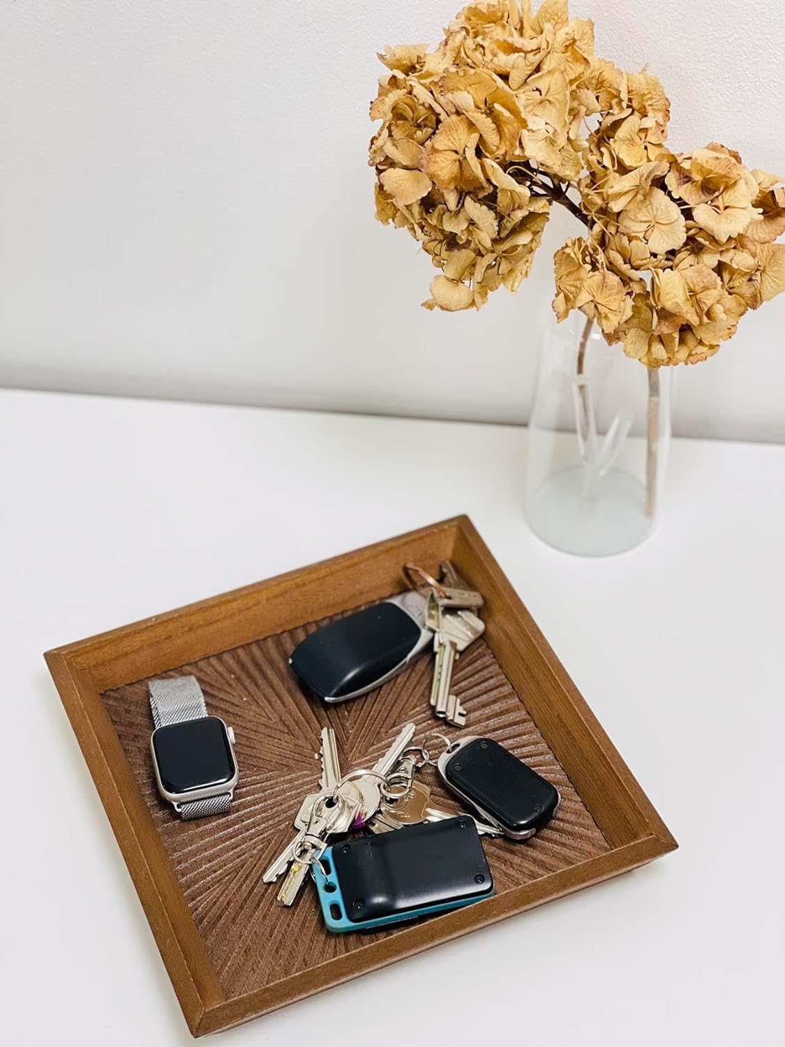 Material: madera Medidas: 20.5 x 20.5 x 2.7 cm Bandeja vaciabolsillos Sus medidas y forma permiten dejar gran cantidad de objetos y tenerlos ordenados Ideal para recibidores, oficinas o habitaciones