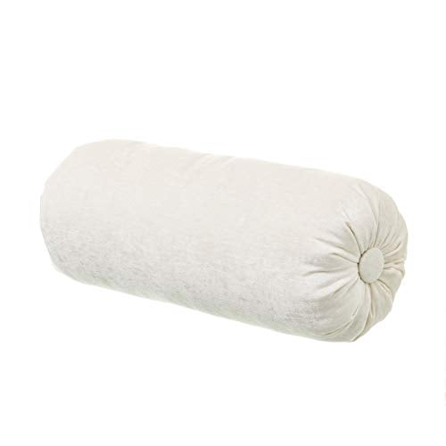 Cojín capitoné de color blanco fabricado en microfibra de chenilla opaca lisa con laterales plisados y botón forrado de medidas 45x18 cm