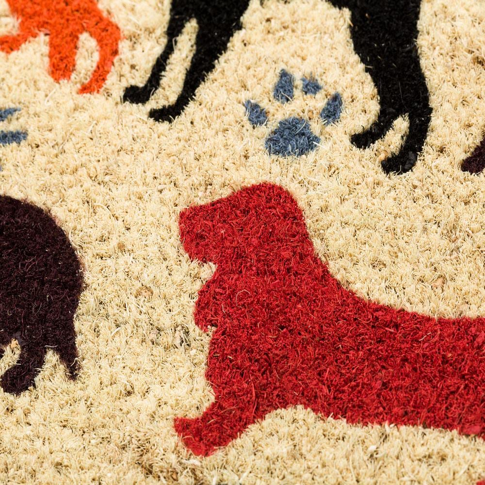 - Felpudo de fibra de coco multicolor, con perros, para la entrada. El resistente felpudo tejido con fibras naturales tiene la trasera antideslizante, fabricada en PVC, se adhiere al suelo y no se desliza. Un felpudo con alto poder de quitar la suciedad de los zapatos y dar la mejor bienvenida a tus visitas. El felpudo tiene un original diseño moderno rectangular, con estampación de perros y huellas. Reúne todas las cualidades de la fibra natural de coco, es súper absorbente, resistente, duradero