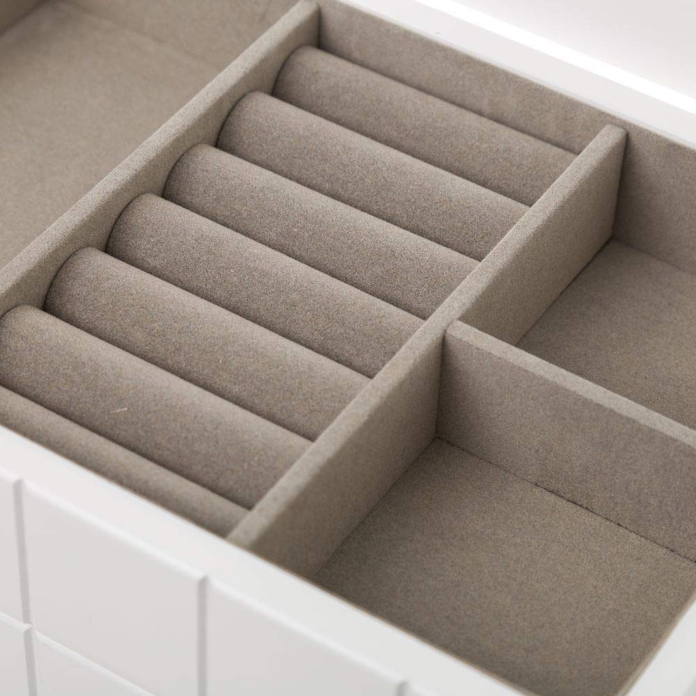 Tiene formato rectangular con 3 alturas, distribuidas en 2 cajones con 2 y 3 separadores, y una bandeja superior organizadora de anillos, pendientes y accesorios pequeños.