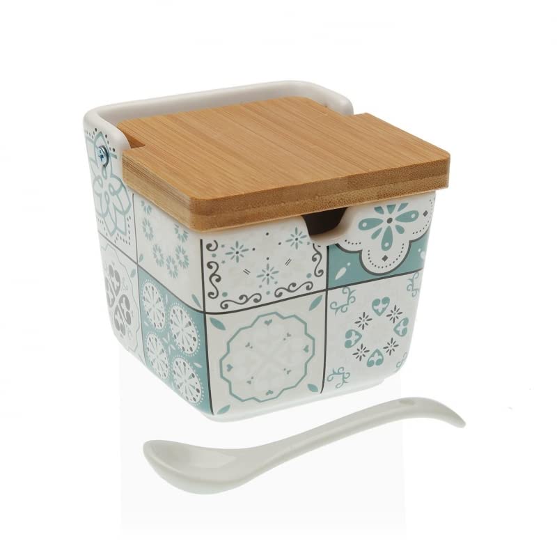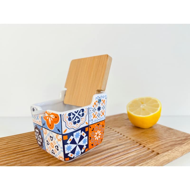 - Azucarero de Cocina de Cerámica con Tapa de madera Diseños Originales Mosaico Bicolor Azul-Amarillo
