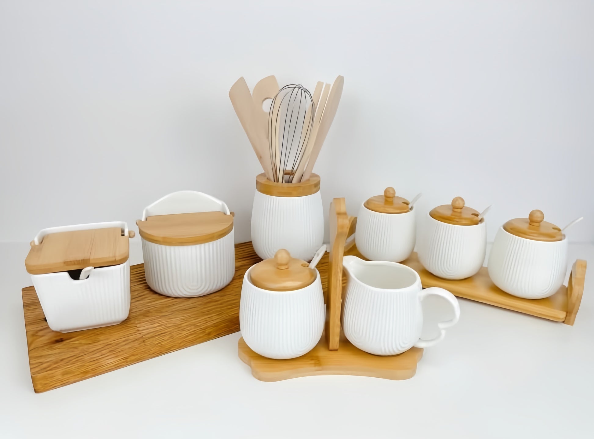 Sarero y Azucarero de Porcelana Blanco con Tapa de Madera Estilo Nordico…