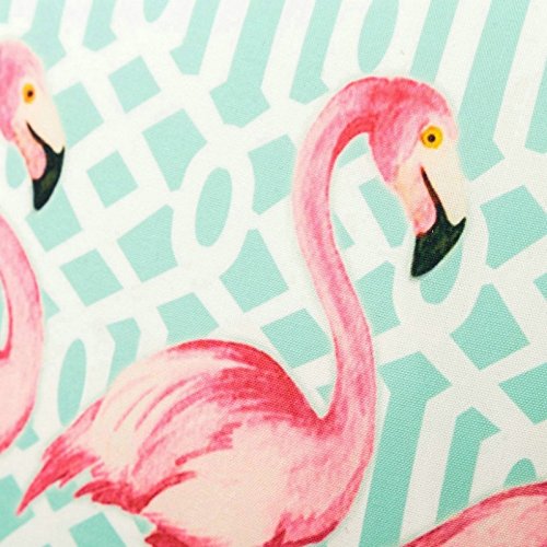 Tiene un bonito y original diseño con formas geométricas en diferentes colores pastel, con tres avestruces en el centro en color rosa.