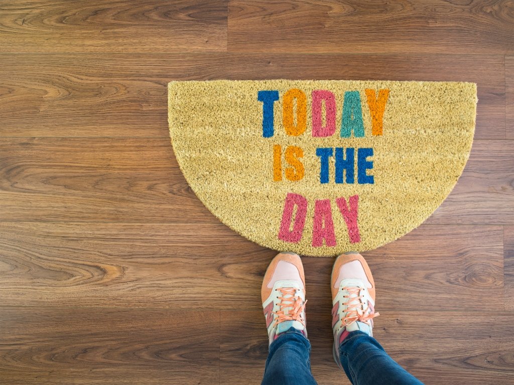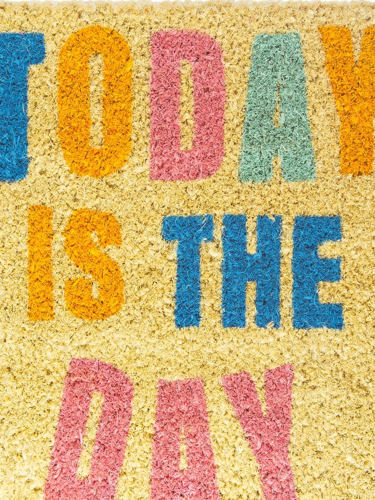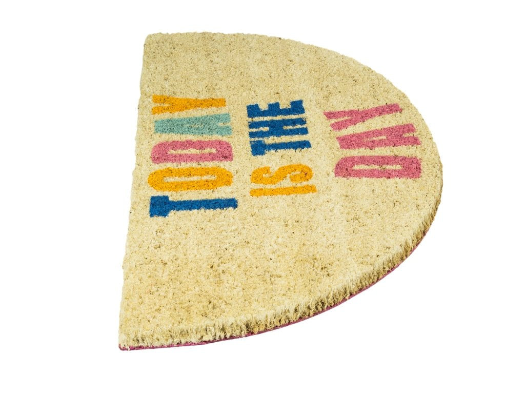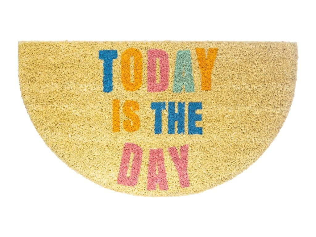 - Divertido felpudo semicircular con la frase “Today is the day” (Hoy es el día) con letras multicolor y color de fondo rosa