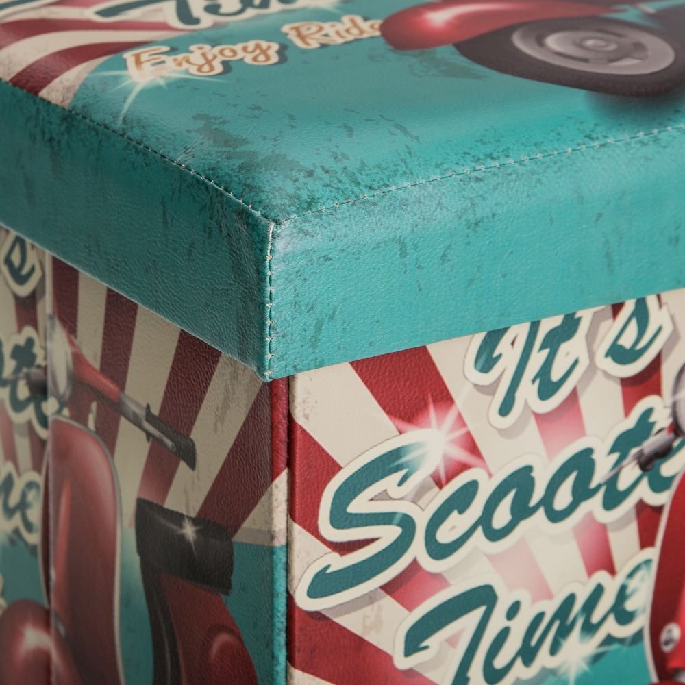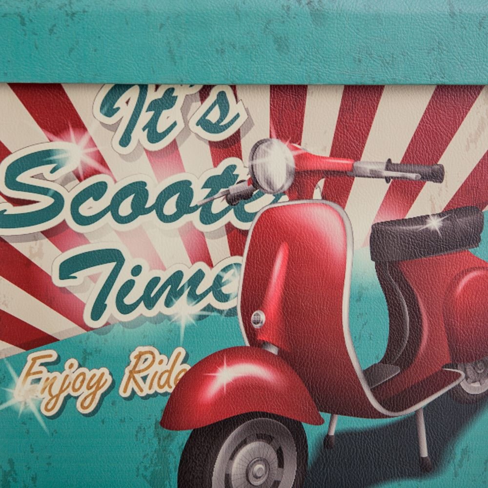 Está fabricado en madera Dm, forrado en Pu, símil piel, es de estilo pop Iris y lleva acabado decorativo en azul turquesa con estampado de Scooter y foto de moto tipo Vespa.