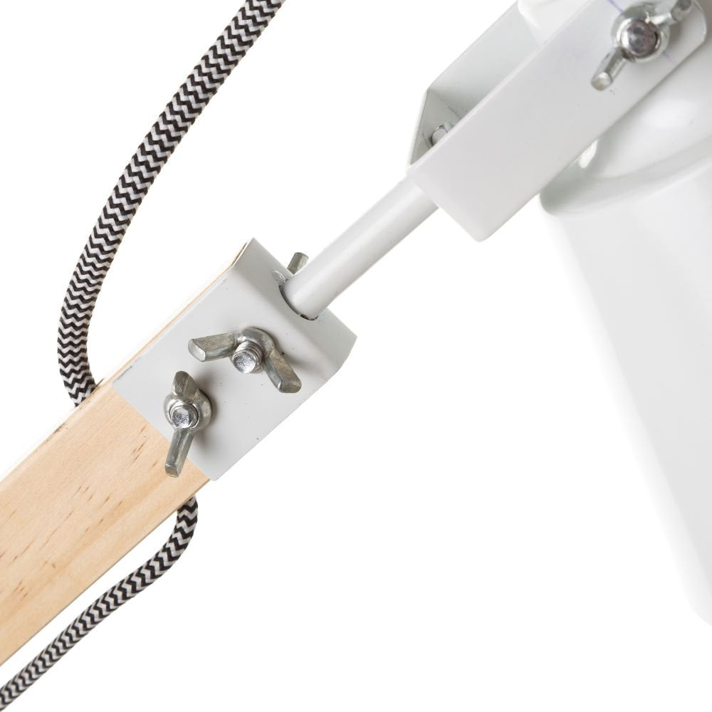 La lámpara flexo está fabricada con madera de abeto y metal, el soporte es de madera color natural, y la base con la pantalla de embudo son de metal lacados en blanco.