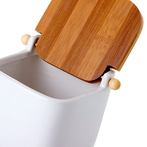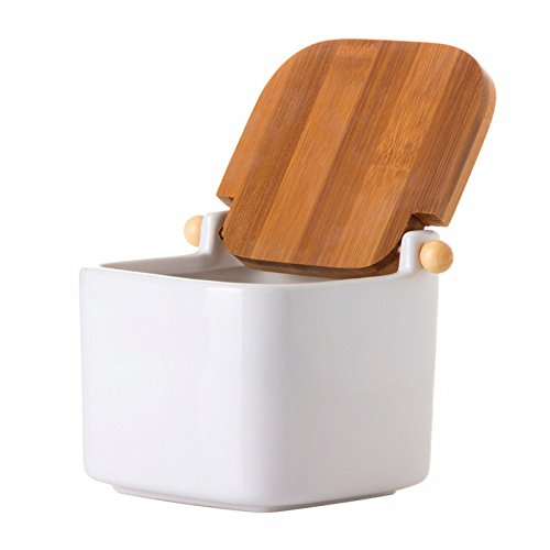 Clasico Salero blanco cerámica con tapa de bambú. 12x12x11cm , ideal para cocina basica