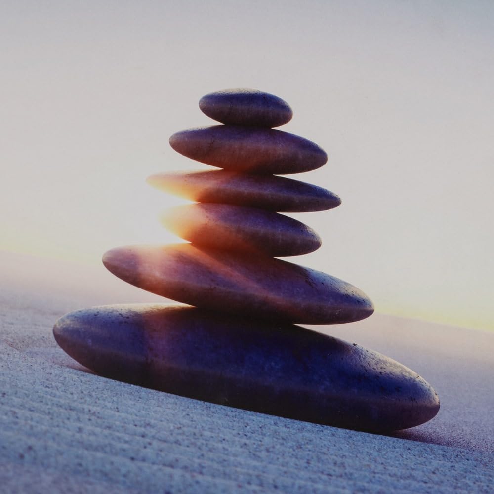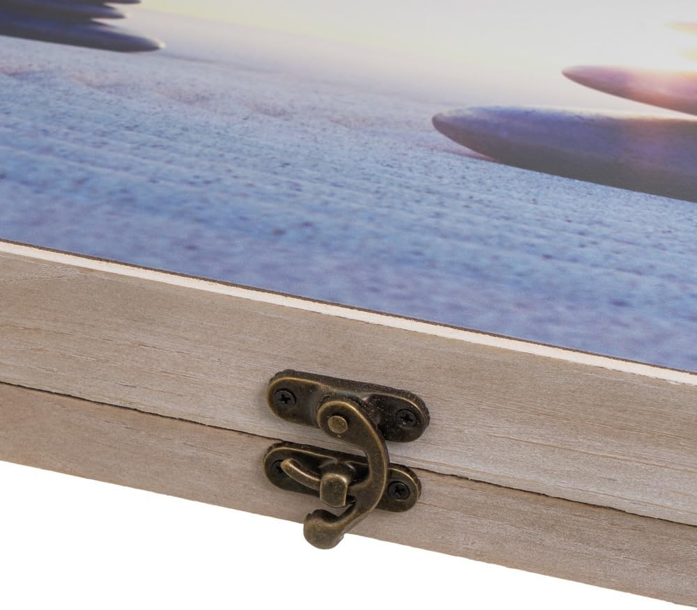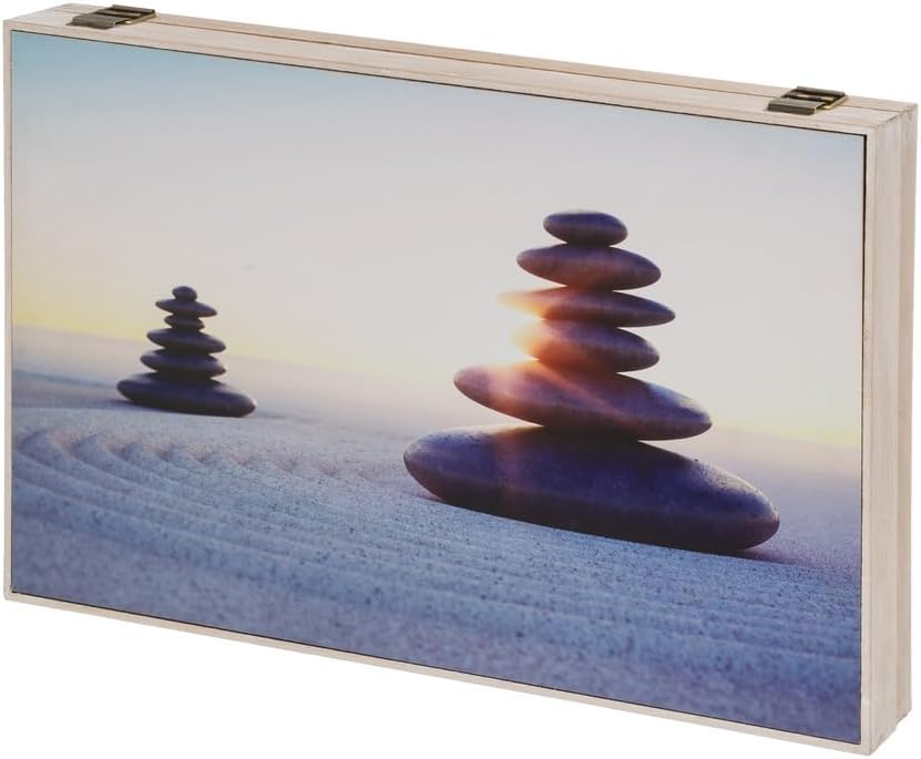 - Tapa contador luz o cuadro eléctrico rectangular, fabricada con madera MDF, decorada con una foto de piedras redondeadas apiladas verticalmente sobre un lecho de arena, reflejado en tonos de azul, marrón y blanco.