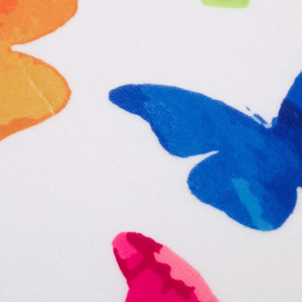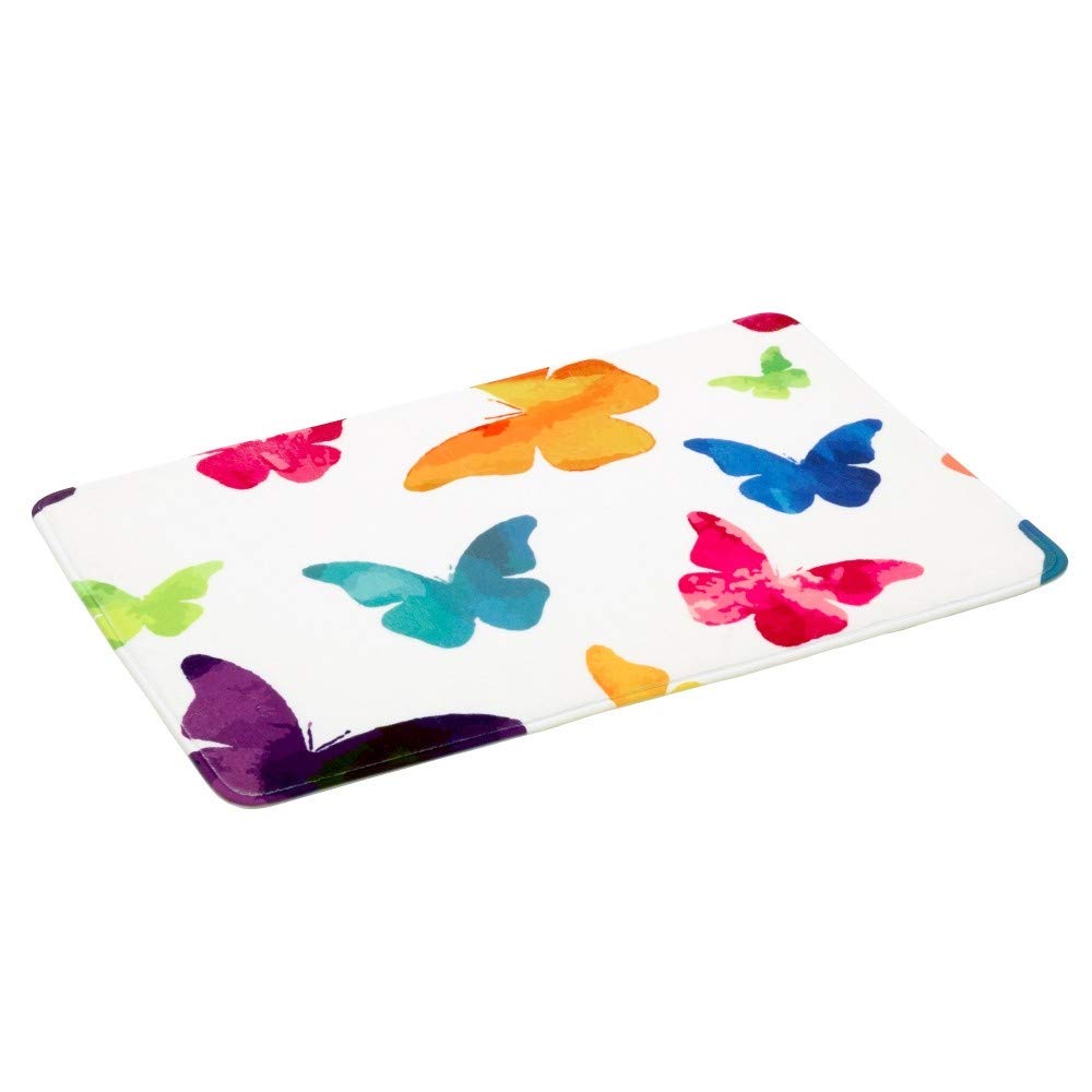 Si deseas tener un look en el baño actual y moderno DCASA te muestra esta alfombra blanca con estampado de mariposas de colores.