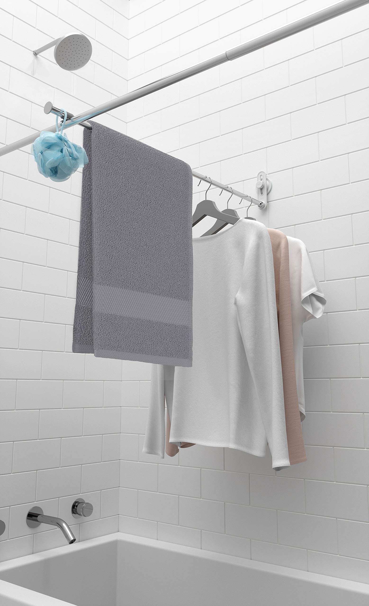 - Haz que tu ducha sea multifuncional: la barra seca se bloquea en su lugar desde la barra de ducha, creando una formación en forma de T. Úsalo para colgar la ropa para secar, o presionar las arrugas con vapor de la ducha.