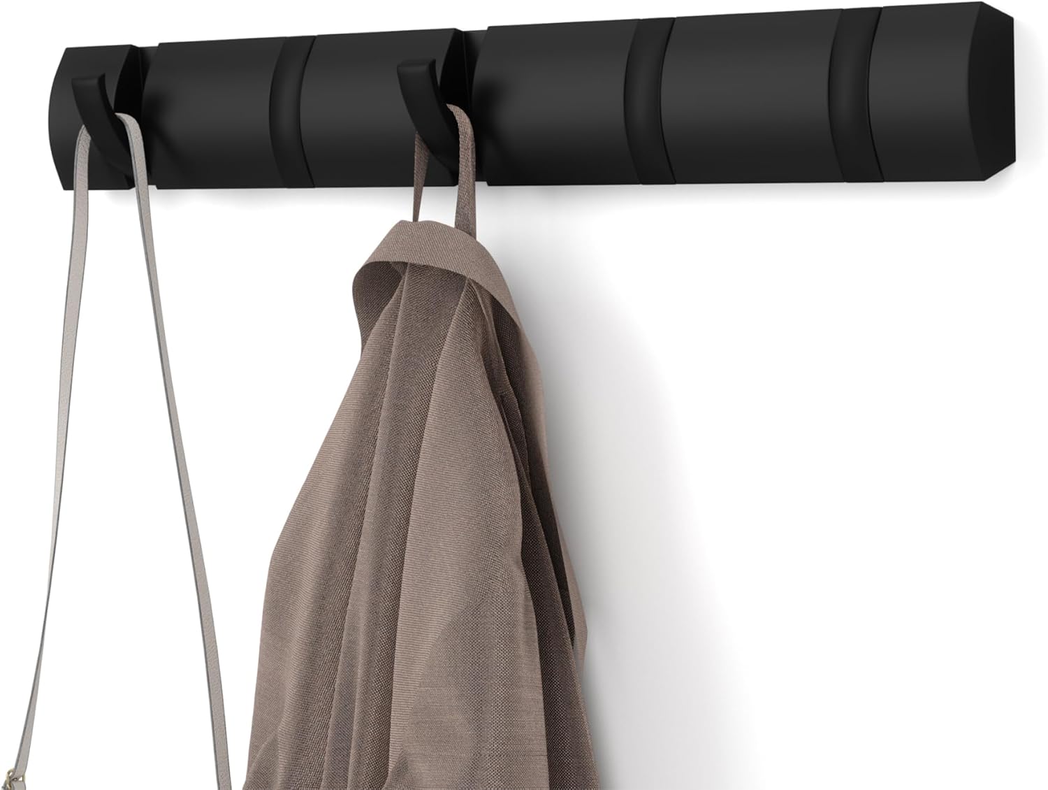 - PERCHA DE PARED MULTIUSOS: Más que un simple perchero, el Flip de Umbra es un riel montado en la pared que cuenta con ganchos retráctiles para colgar diversos artículos, tales como abrigos, bufandas, bolsos, paraguas, toallas, prendas de vestir y más