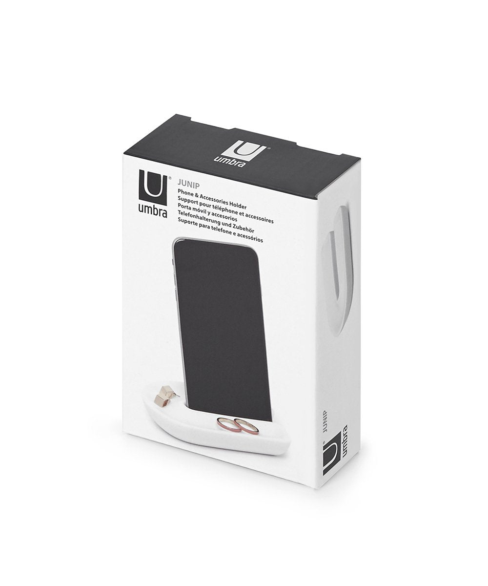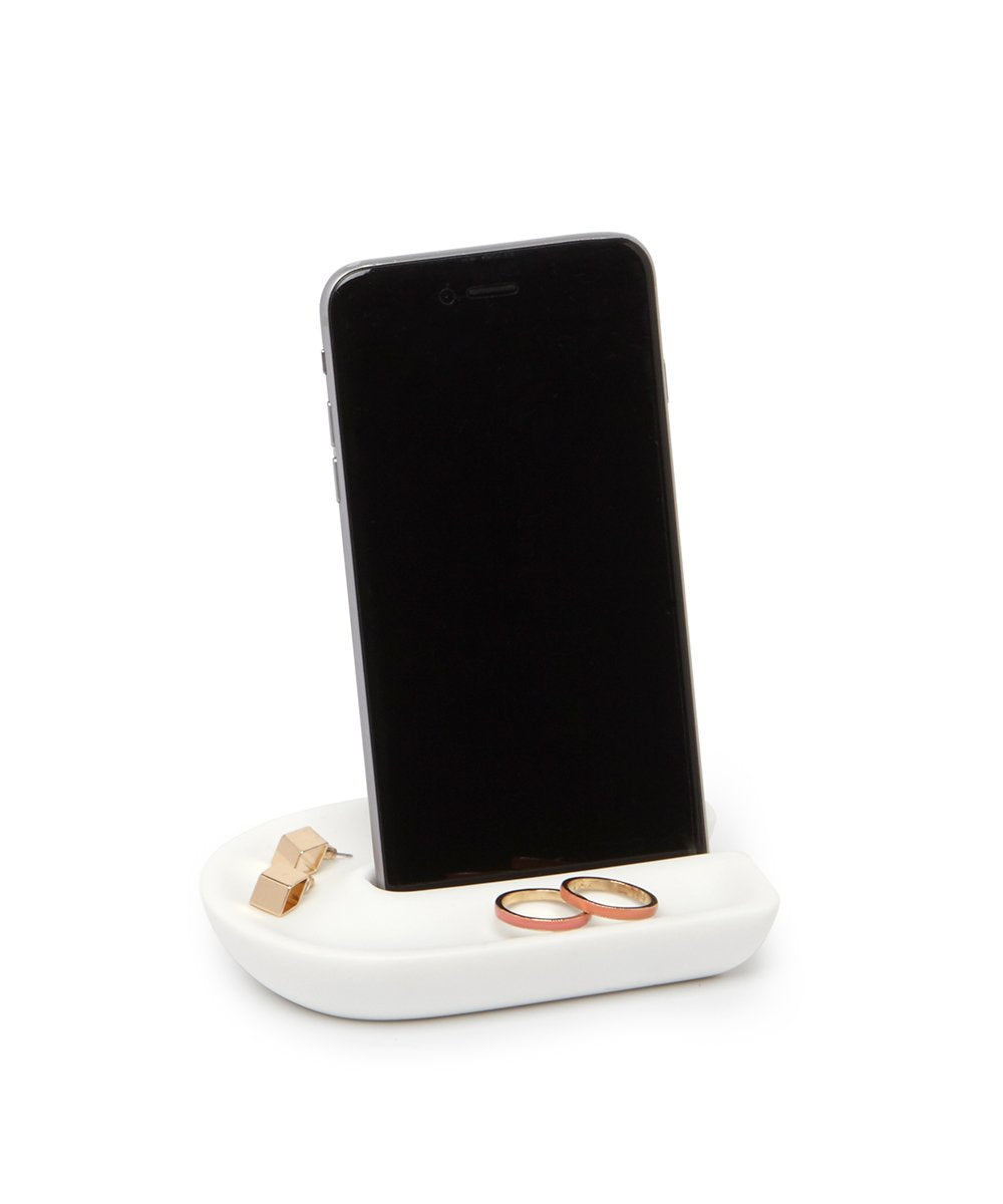 - Soporte para teléfono con bandeja: un soporte para teléfono en forma de U con una bandeja integrada para pequeñas piezas de joyería, su acabado mate se siente como un guijarro suave al tacto, queda genial en una mesita de noche