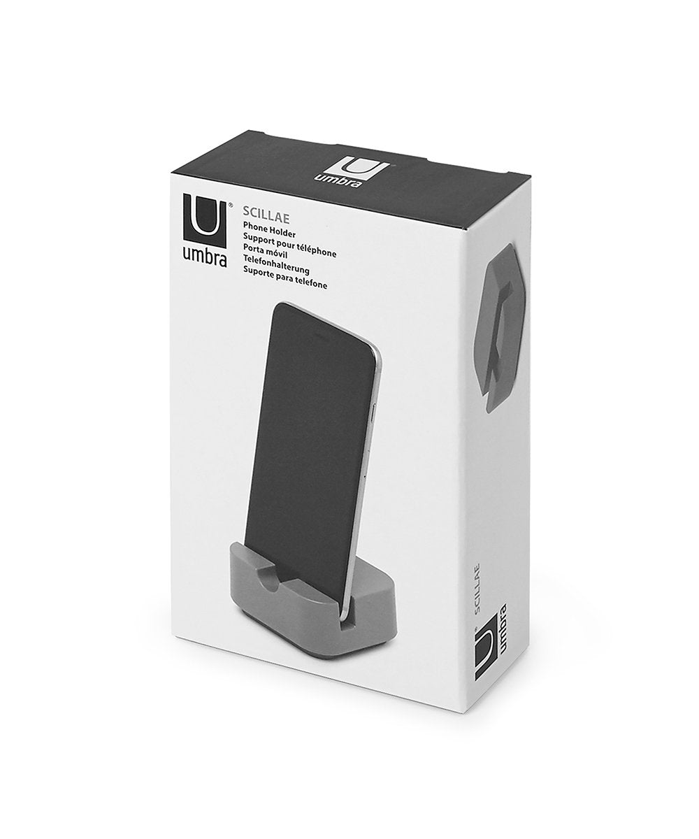 Contenido:1 Umbra Scillae Iphone Holder, Mobile Phone Holder, Smartphone Holder, Melamine, Anthracite, 8 cm, 1009271-149 , Este soporte para el mÃvil, que libera espacio en el lavabo, forma parte de una gran lÃnea de accesorios para el baÃo. Este soporte para telÃfonos mÃviles de color gris oscuro, con sus lÃneas arquitectÃnicas y su acabado mate, combina con una amplia gama de decoraciones de baÃo. Aporta un toque de modernidad a los interiores mÃs tradicionales y se integra perfectamente en la decoraciÃn contemporÃnea. El soporte para mÃvil Scillae mide 8 x 8 x 3,5 cm y tiene un hueco visible para mantener el telÃfono seco. Este soporte para telÃfonos mÃviles tambiÃn queda muy bien en las mesillas de noche y en las encimeras de la cocina. Resistente. Fabricado en melamina, el soporte para el mÃvil parece de cerÃmica pero no se rompe si se cae al suelo. Los pigmentos de color gris oscuro quedan fijados en la melamina, lo que significa que, incluso con el paso del tiempo, no se apreciarÃn signos de uso o araÃazos. Hace que su lavabo parezca mÃs ordenado. Los accesorios mÃs pequeÃos de esta lÃnea estÃn diseÃados para ser almacenados en el estante de pared Scillae, lo que hace que su lavabo parezca mucho mÃs ordenado. El estante de pared tambiÃn es un verdadero punto de atracciÃn, ya que recuerda al tradicional estante de boticario, sÃlo que con un toque moderno. Los accesorios de baÃo mÃs grandes de esta lÃnea incluyen una caja de paÃuelos, una papelera y un dispensador de jabÃn. Acerca de Umbra: Umbra es una empresa de diseÃo que opera a nivel internacional, conocida por sus productos originales, modernos, funcionales y asequibles para el hogar y la vida. • Nueva incorporaciÃn a la colecciÃn de baÃo de la firma, este soporte de mÃvil gri
