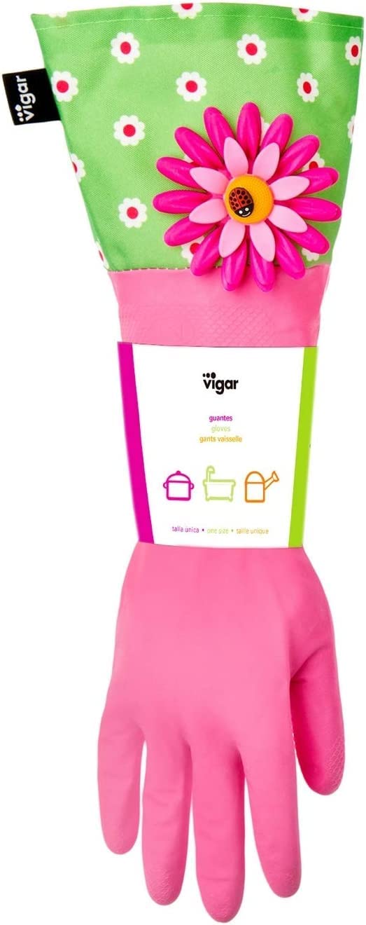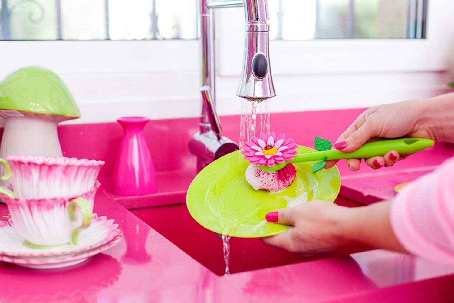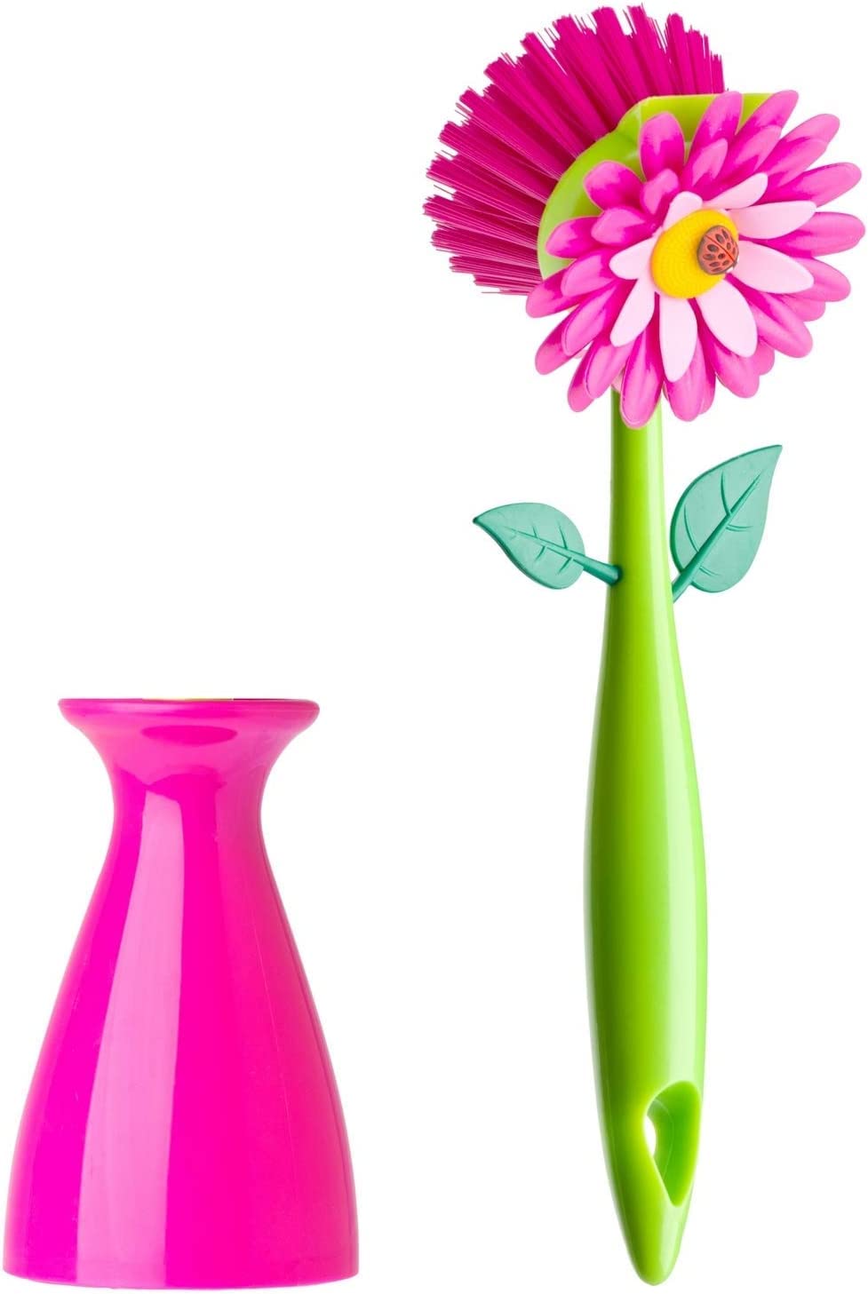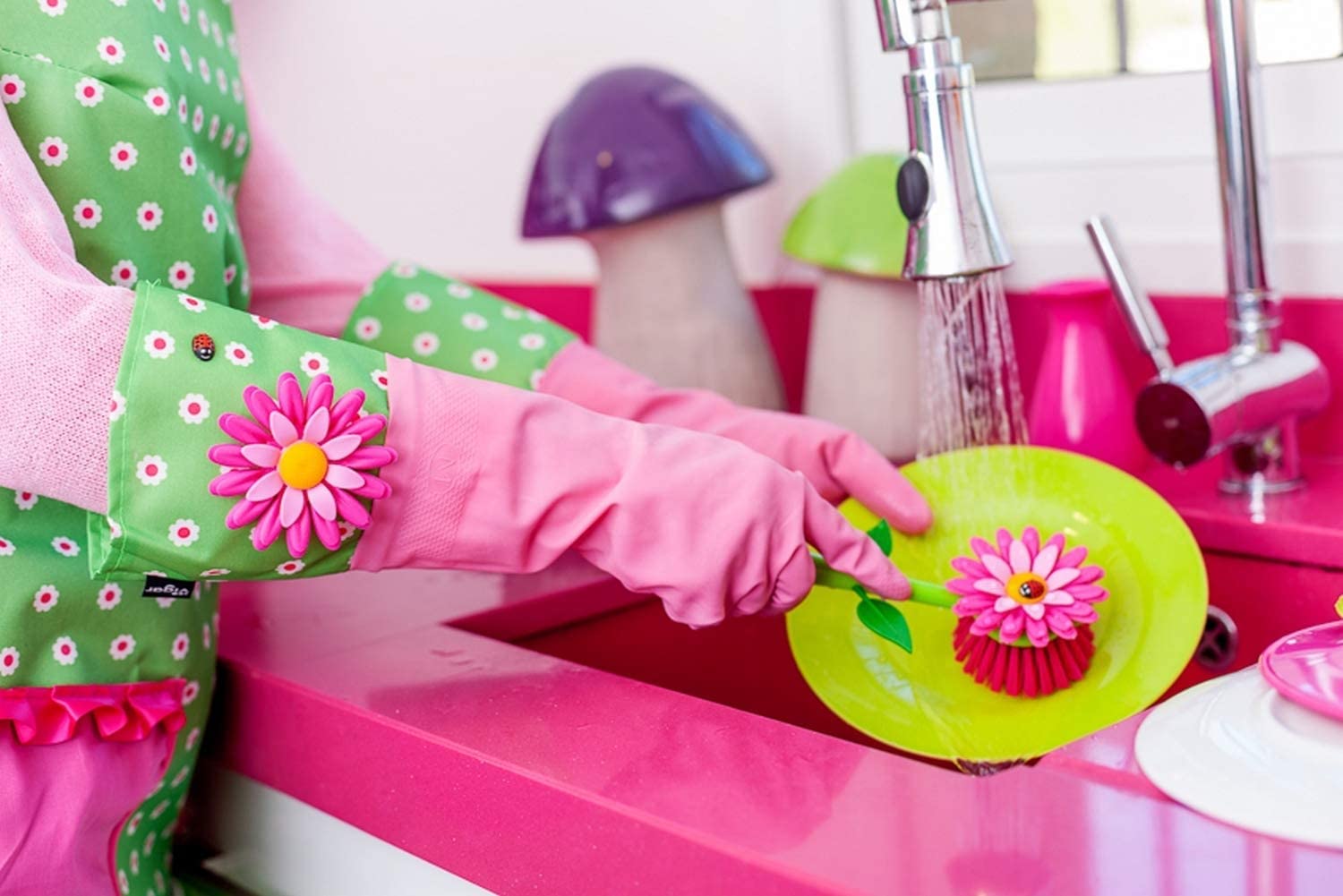 Juego de 3 Piezas Cocina - Guantes, Cepillo con Soporte y Portaesponjas - 12.5 x 7.5 x 18 cm - Flower Power - Guantes de Látex - Verde, Rosado