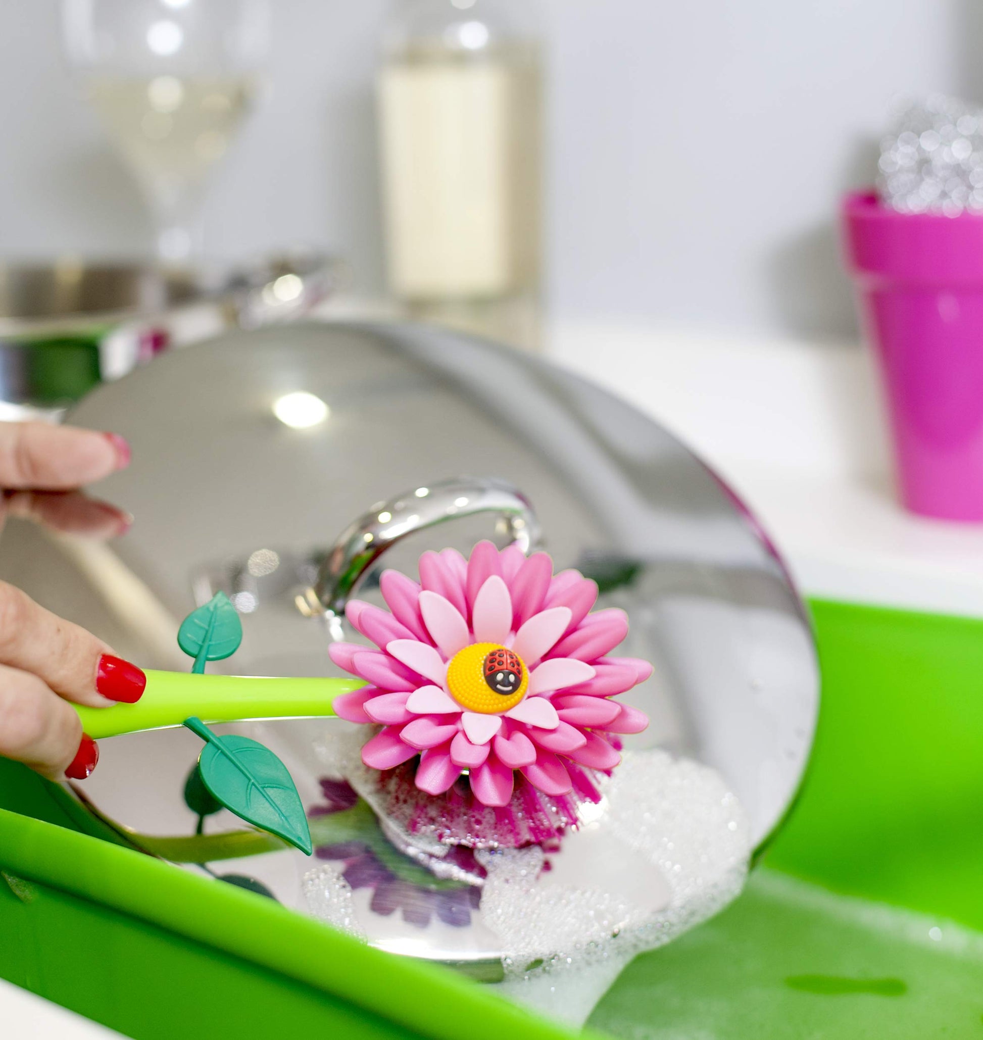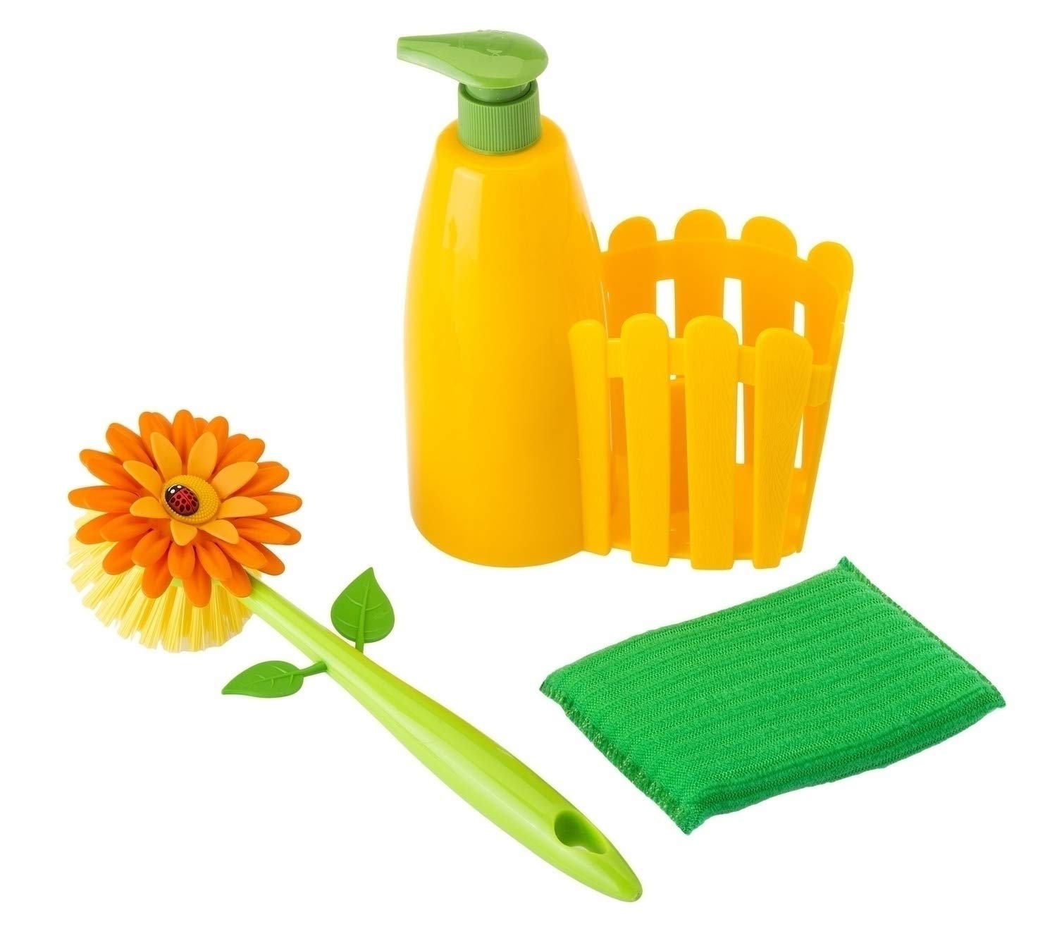 Vigar - Set Fregadero - Pack Soporte, Cepillo Lavaplatos, Esponja - 7 x 14 x 26.5 cm - Flower Power - con Dispensador - Bandeja de 3 Piezas