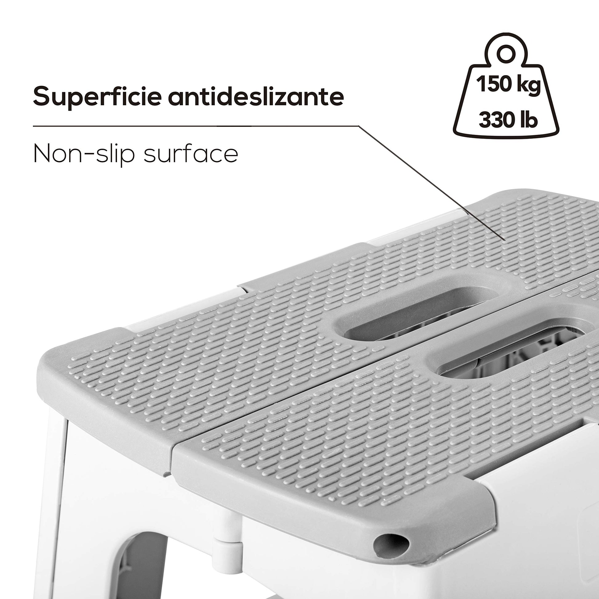 - TABURETE PLEGABLE COMPACT: Taburete plegable con superficie y base antideslizantes para evitar resbalones. Contiene un asa central con doble función para un transporte más fácil y su plegado total en segundos con una sola mano.