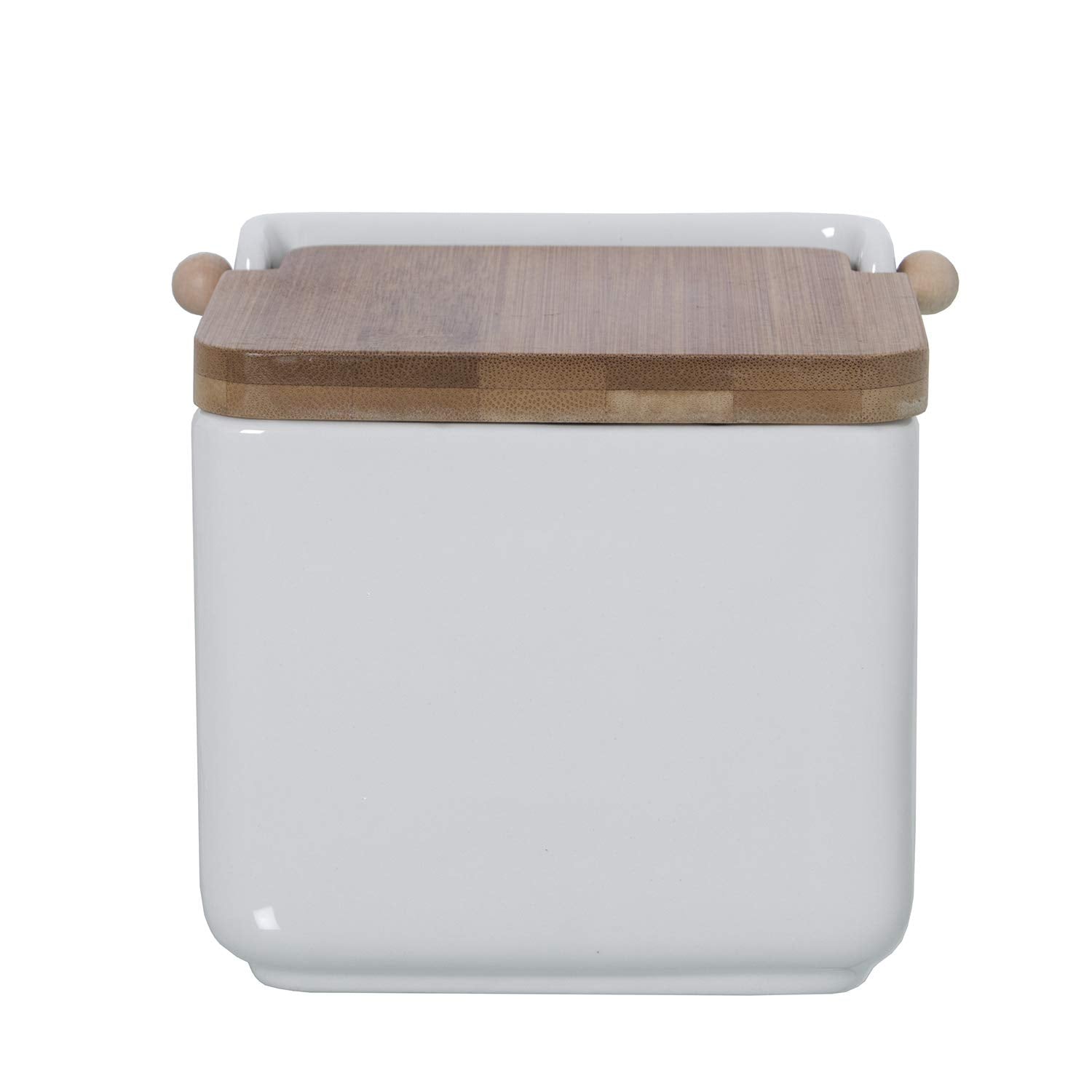 Salero Cocina Cerámica Tapa madera Blanco, 12x12x11 cm